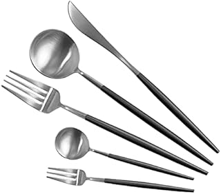 cuton カトラリー セット スプーン フォーク ナイフ 箸 1名 用 ディナースプーン ディナーフォーク テーブルナイフ 5本セット ポルトガル クチポール風 キッズ レストラン 洋 食器 キッチン 18-8 ステンレス ステーキ ピザ パスタ デザート ケーキ コーヒー ホーム レストラン ディナー 結婚祝い プレゼント ギフト (ブラックシルバー, 5本セットB)