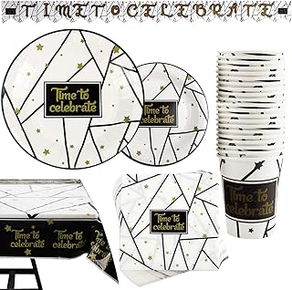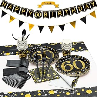 CrzPai 60歳の誕生日パーティー用品 ブラックとゴールドのテーブルウェア 垂れ幕付き 使い捨て食器セット 紙製誕生日プレート ナプキン カップ テーブルカバー フォーク ナイフ スプーン 24人用