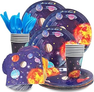 CIEOVO 宇宙パーティー用品 - 24人用 - プレート、ナイフ、スプーン、フォーク、カップ、ナプキン 完璧な宇宙 誕生日パーティーパック 子供用 太陽系 惑星テーマ パーティー ブルー XQ1-0
