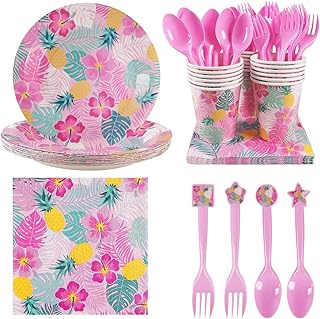 Cieovo ハワイアン パイナップル パーティー用品 – パーティープレート、スプーン、フォーク、カップ、ナプキン パーティーパック ハワイアンアロハ トロピカルフラワーテーマの誕生日パーティーデコレーションに最適