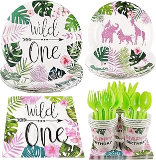Cieovo Wild One パーティー用品 - 16人前 パーティープレート スプーン フォーク ナイフ カップ ナプキン パーティーパック サファリ動物テーマ 女の子 誕生日 ベビーシャワーパーティーデコレーション